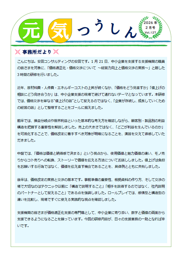 こんにちは。安田コンサルティングの安田です。1月21日、中小企業を支援する支援機関の職員の皆さまを対象に、「価格適正化・価格交渉について ~経営力向上と価格交渉の実務~」と題した3時間の研修を行いました。