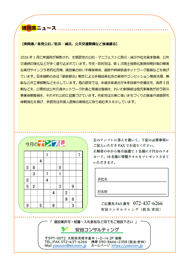 2026年1月に衆議院が解散され、主要政党の公約・マニフェストに防災・減災や社会資本整備、公共交通網の強化などが多く盛り込まれています。与党・自民党は、第1次国土強靱化実施中期計画の確実な実行やインフラ老朽化対策、建設業の担い手確保育成、道路や幹線鉄道ネットワーク整備などを掲げています。日本維新の会は「副首都法」制定による多極成長社会の実現やコンセッション制度活用、無駄な公共工事抑制などを示しています。他の政党では、中道改革連合が未来投資や安価住宅、週休3日制などを、公明党は公共交通ネットワーク計画と関連法整備を、れいわ新撰組は地元事業者が担う防災事業体制整備を、それぞれ公約に位置づけています。共産党は災害に強いまちづくりの推進や調査研究体制強化を掲げ、参政党は外国人政策の厳格化に取り組む考えを示しています。